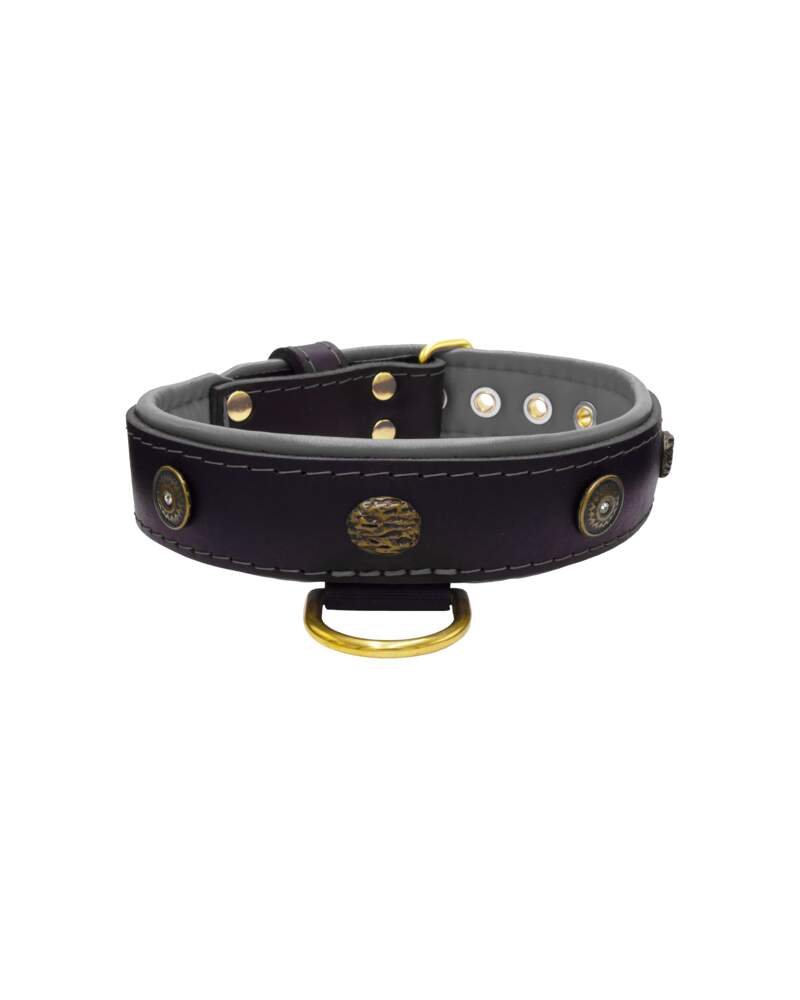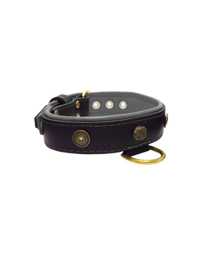It is adorned with subtle small metal motifs, including an impressive round rhinestone shield and carved oval hammered stones, offering an elegant appearance. Durable polyester stitching ensures long-term resistance to wear and tear. It features a solid bonded brass half-ring for secure attachment to the leash, and closes with a sturdy bonded brass buckle and high-strength rivets.